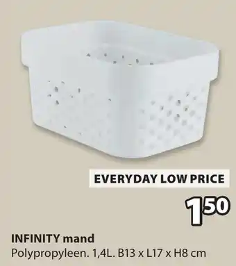 De prijs van de INFINITY mand kan ook teruggevonden worden hierboven op de pagina, samen met de datum van wanneer de aanbieding beschikbaar is. Ook kun je de prijzen in de huidige Jysk folder of op de Jysk website controleren. De aanbiedingen verzekeren je van het kopen van de Jysk producten voor de laagste prijs.