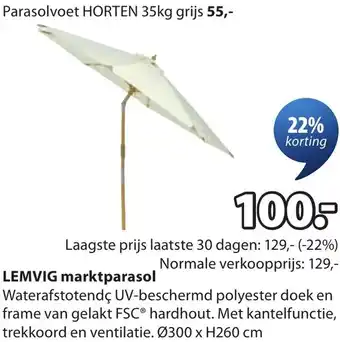 De prijs van de Lemvig marktparasol kan ook teruggevonden worden hierboven op de pagina, samen met de datum van wanneer de aanbieding beschikbaar is. Ook kun je de prijzen in de huidige Jysk folder of op de Jysk website controleren. De aanbiedingen verzekeren je van het kopen van de Jysk producten voor de laagste prijs.