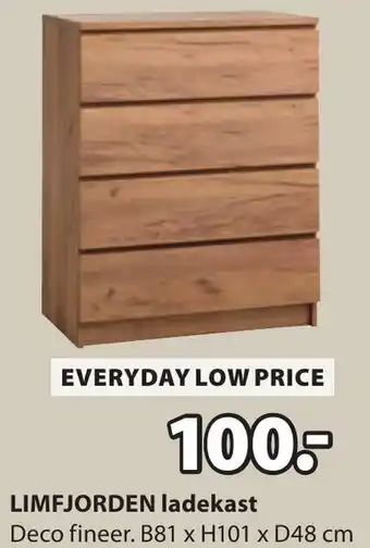 De LIMFJORDEN ladekast is een stijlvolle toevoeging aan elk interieur. Met zijn afmetingen van B81 x H101 x D48 cm biedt deze kast voldoende opbergruimte voor al je spullen. De ladekast is gemaakt van hoogwaardig Deco fineer, wat zorgt voor een luxe uitstraling. Dankzij het tijdloze design past de kast perfect in zowel moderne als klassieke interieurs. En het beste van alles is de prijs: slechts 100.-! Bij deze Everyday Low Price hoef je dus niet te twijfelen over je aankoop. Haal de LIMFJORDEN ladekast vandaag nog in huis en geniet van een opgeruimde en stijlvolle woonkamer.