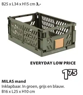 De MILAS mand is een handige opbergoplossing voor alledaags gebruik. Met een afmeting van B16 x L25 x H10 cm biedt deze inklapbare mand voldoende ruimte voor het opbergen van diverse spullen. Verkrijgbaar in de kleuren groen, grijs en blauw, past deze mand perfect bij elk interieur. Dankzij de EVERYDAY LOW PRICE is deze mand betaalbaar voor iedereen. Of je nu kleding, speelgoed of andere spullen wilt opbergen, de MILAS mand is de ideale keuze. De stevige constructie zorgt ervoor dat de mand lang meegaat en de handvatten maken het gemakkelijk om de mand te verplaatsen. Kies voor gemak en stijl met de MILAS mand!