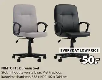 De prijs van de Nimtofte bureaustoel kan ook teruggevonden worden hierboven op de pagina, samen met de datum van wanneer de aanbieding beschikbaar is. Ook kun je de prijzen in de huidige Jysk folder of op de Jysk website controleren. De aanbiedingen verzekeren je van het kopen van de Jysk producten voor de laagste prijs.