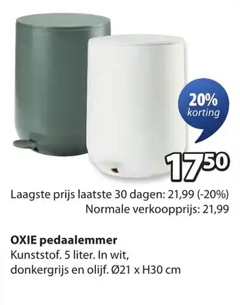 De prijs van de Oxie pedaalemmer kan ook teruggevonden worden hierboven op de pagina, samen met de datum van wanneer de aanbieding beschikbaar is. Ook kun je de prijzen in de huidige Jysk folder of op de Jysk website controleren. De aanbiedingen verzekeren je van het kopen van de Jysk producten voor de laagste prijs.