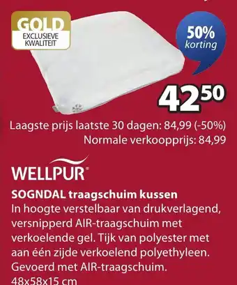 Het SOGNDAL traagschuim kussen is een kussen van exclusieve kwaliteit, gemaakt van drukverlagend, versnipperd AIR-traagschuim met verkoelende gel. De tijk van polyester is aan één zijde voorzien van verkoelend polyethyleen. Het kussen is in hoogte verstelbaar en heeft een afmeting van 48x58x15 cm. Normaal gesproken kost dit kussen 84,99, maar nu is het verkrijgbaar met maar liefst 50% korting voor slechts 42,50! Profiteer van deze aanbieding, want de laagste prijs van de afgelopen 30 dagen was 84,99. Dit kussen van WELLPUR biedt optimaal comfort en ondersteuning voor een goede nachtrust. Haal nu dit hoogwaardige kussen in huis en geniet van een heerlijke nachtrust!