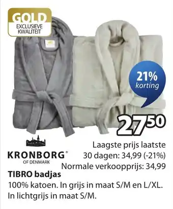 De Tibro badjas van KRONBORGⓇ OF DENMARK is gemaakt van 100% katoen en verkrijgbaar in grijs in maat S/M en L/XL, en in lichtgrijs in maat S/M. Deze badjas biedt ultiem comfort en luxe dankzij de exclusieve kwaliteit. Normaal geprijsd op 34,99, maar nu met 21% korting voor slechts 27,50. Dit is de laagste prijs van de afgelopen 30 dagen. Mis deze kans niet om deze hoogwaardige badjas aan te schaffen voor een betaalbare prijs. Geniet van de zachtheid en warmte van de Tibro badjas en verwen jezelf met een stukje luxe in huis. Bestel nu en ervaar het comfort van KRONBORGⓇ OF DENMARK!