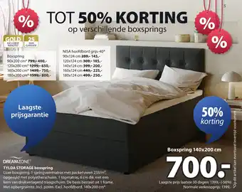 De Tylda storage boxspring is momenteel met korting verkrijgbaar bij Jysk. Hier vind je alle details over prijs, geldigheidsduur en actievoorwaarden. Vergeet niet om ook andere aanbiedingen en deals voor Tylda storage boxspring te bekijken zodat je zeker weet dat je de beste prijs betaalt. De kortingsactie loopt van 19-01-2026 tot 01-02-2026. Is de actie inmiddels verlopen? Geen zorgen, vergelijk dan soortgelijke aanbiedingen of volg de productcategorie voor toekomstige prijsverlagingen. Zo koop je altijd met voordeel.Veelgestelde vragen over Tylda storage boxspring