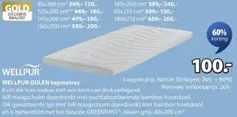 De prijs van de Wellpur Gulen topmatras kan ook teruggevonden worden hierboven op de pagina, samen met de datum van wanneer de aanbieding beschikbaar is. Ook kun je de prijzen in de huidige Jysk folder of op de Jysk website controleren. De aanbiedingen verzekeren je van het kopen van de Jysk producten voor de laagste prijs.