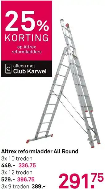 De prijs van de Altrex reformladder All Round kan ook teruggevonden worden hierboven op de pagina, samen met de datum van wanneer de aanbieding beschikbaar is. Ook kun je de prijzen in de huidige Karwei folder of op de Karwei website controleren. De aanbiedingen verzekeren je van het kopen van de Karwei producten voor de laagste prijs.