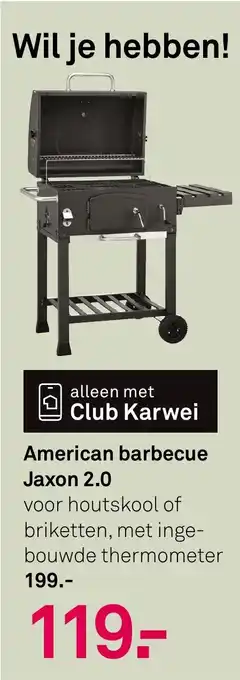 De American barbecue Jaxon 2.0 is een must-have voor liefhebbers van barbecueën. Deze barbecue is alleen verkrijgbaar met Club Karwei en biedt de mogelijkheid om te kiezen tussen houtskool of briketten. Met een ingebouwde thermometer kun je de temperatuur nauwkeurig in de gaten houden en zo perfect gegaard vlees bereiden. Voor slechts 199.- kun je deze barbecue al in huis halen, maar Club Karwei leden profiteren van een speciale prijs van 119.-. Of je nu een ervaren barbecueër bent of net begint, de American barbecue Jaxon 2.0 is een aanwinst voor iedere tuin of terras. Wil je hebben!