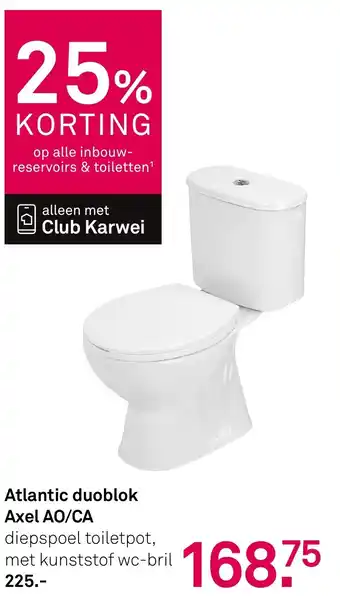 Profiteer nu van 25% korting op alle inbouwreservoirs en toiletten bij Club Karwei. Een van de aanbiedingen is de Atlantic duoblok Axel AO/CA diepspoel toiletpot met kunststof wc-bril. Normaal kost deze set 225 euro, maar met de korting betaal je slechts 168.75 euro. Deze duoblok is van hoge kwaliteit en heeft een modern design. Het is een praktische en stijlvolle toevoeging aan je badkamer of toiletruimte. De Axel AO/CA is eenvoudig te installeren en schoon te houden. Profiteer nu van deze geweldige aanbieding en geef je badkamer een upgrade met een nieuw toilet van Club Karwei!