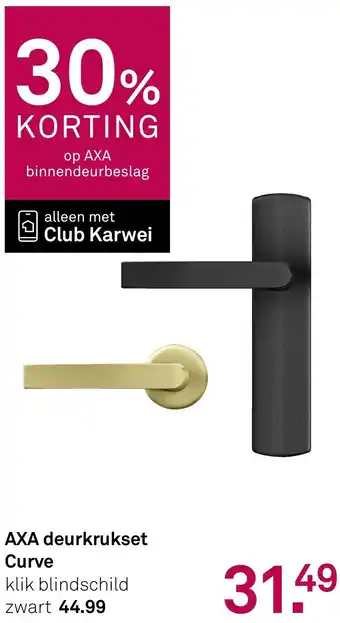 De prijs van de AXA deurkrukset Curve kan ook teruggevonden worden hierboven op de pagina, samen met de datum van wanneer de aanbieding beschikbaar is. Ook kun je de prijzen in de huidige Karwei folder of op de Karwei website controleren. De aanbiedingen verzekeren je van het kopen van de Karwei producten voor de laagste prijs.