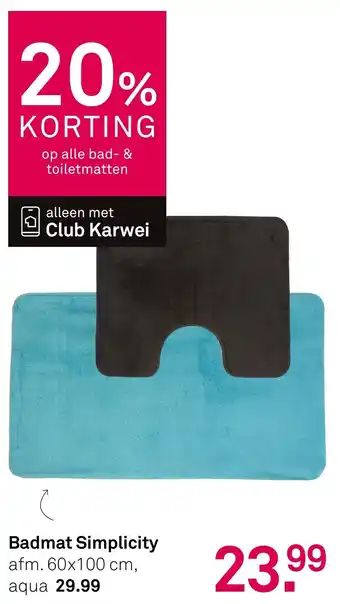 De prijs van de Badmat Simplicity kan ook teruggevonden worden hierboven op de pagina, samen met de datum van wanneer de aanbieding beschikbaar is. Ook kun je de prijzen in de huidige Karwei folder of op de Karwei website controleren. De aanbiedingen verzekeren je van het kopen van de Karwei producten voor de laagste prijs.