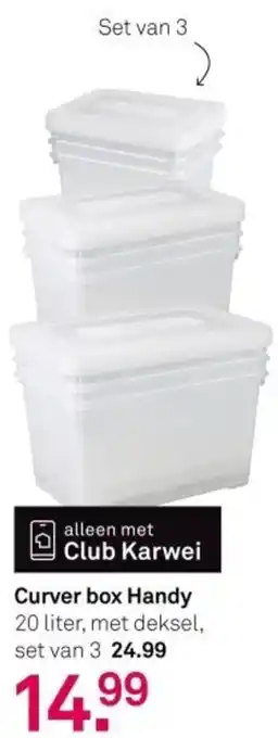 De Curver box Handy is een handige opbergbox van 20 liter met deksel. Deze set van 3 opbergboxen is alleen verkrijgbaar bij Club Karwei voor slechts 24.99. De boxen zijn ideaal voor het opbergen van spullen in huis, op kantoor of in de garage. Dankzij het transparante design zie je in één oogopslag wat er in de box zit. De boxen zijn stapelbaar en gemakkelijk te verplaatsen dankzij de handige handvatten. Met deze set van 3 Curver box Handy 20 liter met deksel houd je jouw spullen georganiseerd en overzichtelijk. Bestel ze nu en profiteer van deze voordelige aanbieding!