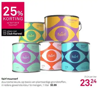 Maak een duurzame keuze met Fairf muurverf, op basis van plantaardige grondstoffen. Alleen met Club Karwei ontvang je nu 25% korting op Fairf lak & muurverf. Deze multi-inzetbare muurverf is in iedere gewenste kleur te mengen en kost slechts €23,24 per liter. Met een liter Fairf muurverf kun je flink wat oppervlakte voorzien van een prachtige nieuwe kleur. Profiteer nu van deze aanbieding en geef je interieur een frisse uitstraling met Fairf muurverf. De korting geldt zowel voor muurverf als voor lakverf, dus je kunt je hele huis een make-over geven met deze milieuvriendelijke verfsoort. Kom snel naar Club Karwei en sla je slag!