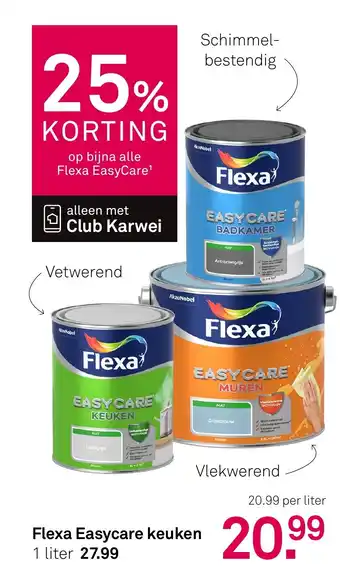 Geef je keuken een frisse uitstraling met Flexa EasyCare keukenverf. Deze verf is speciaal ontwikkeld voor keukens en is schimmelbestendig, vetwerend en vlekwerend. Met de Vlekwerende technologie van AkzoNobel blijft je keuken er langdurig mooi uitzien. De verf is verkrijgbaar in verschillende tinten, zoals Antracietgrijs, Grijsblauw en Lichtgrijs. Alleen met Club Karwei profiteer je nu van 25% korting op bijna alle Flexa EasyCare keukenverf. Zo betaal je slechts €20.99 per liter in plaats van €27.99. Verander de uitstraling van je keuken en geniet van een duurzaam resultaat met Flexa EasyCare keukenverf. Deze aanbieding is geldig voor binnenmuren in de keuken.