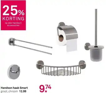 Profiteer nu van 25% KORTING op alle Handson accessoires, waaronder de Handson haak Smart groot in chroom. Normaal gesproken kost deze haak 12.99, maar met de korting betaal je slechts 9.74. De Handson haak Smart is een handige en stijlvolle toevoeging aan je interieur. Met zijn chroom afwerking past hij perfect in elke moderne badkamer of keuken. Hang je handdoeken, theedoeken of andere accessoires gemakkelijk op aan deze haak. De haak is eenvoudig te monteren en van hoge kwaliteit. Mis deze kans niet om jouw interieur te verbeteren met de Handson haak Smart en profiteer van de geweldige korting!