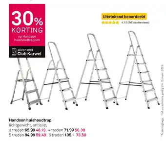 De prijs van de Handson huishoudtrap kan ook teruggevonden worden hierboven op de pagina, samen met de datum van wanneer de aanbieding beschikbaar is. Ook kun je de prijzen in de huidige Karwei folder of op de Karwei website controleren. De aanbiedingen verzekeren je van het kopen van de Karwei producten voor de laagste prijs.