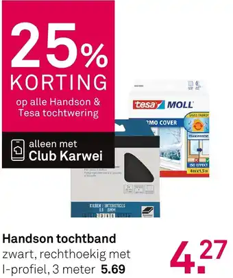 Bespaar energie en bescherm je huis tegen tocht met de Handson tochtband. Deze zwarte rechthoekige tochtband met I-profiel is 3 meter lang en kost nu slechts €5.69. De band is ook transparant verkrijgbaar in de ISO EFFECT 4mx1,5m variant. Met de Handson tochtband dicht je kieren en interstices af, waardoor je huis beter geïsoleerd is. Alleen met Club Karwei krijg je 25% korting op alle Handson & Tesa tochtwering producten, zoals de Handson tochtband. Profiteer nu van deze aanbieding en zorg voor een comfortabel en energiezuinig huis. Sluit deuren en ramen, bescherm ook tegen stof met Handson tochtband!