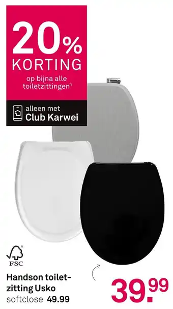 De prijs van de Handson toiletzitting Usko kan ook teruggevonden worden hierboven op de pagina, samen met de datum van wanneer de aanbieding beschikbaar is. Ook kun je de prijzen in de huidige Karwei folder of op de Karwei website controleren. De aanbiedingen verzekeren je van het kopen van de Karwei producten voor de laagste prijs.
