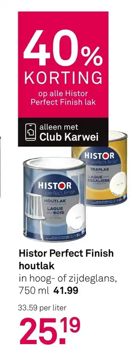 De prijs van de Histor Perfect Finish houtlak kan ook teruggevonden worden hierboven op de pagina, samen met de datum van wanneer de aanbieding beschikbaar is. Ook kun je de prijzen in de huidige Karwei folder of op de Karwei website controleren. De aanbiedingen verzekeren je van het kopen van de Karwei producten voor de laagste prijs.