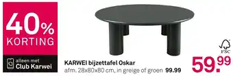 De KARWEI bijzettafel Oskar is nu verkrijgbaar met een korting van maar liefst 40% voor leden van Club Karwei. Deze trendy bijzettafel heeft een afmeting van 28x80x80 cm en is beschikbaar in de kleuren greige of groen. Gemaakt van FSC-gecertificeerd hout, is deze tafel niet alleen stijlvol maar ook duurzaam. Normaal gesproken kost de KARWEI bijzettafel Oskar 99,99, maar met de exclusieve korting voor Club Karwei leden betaal je slechts 59,99. Profiteer nu van deze geweldige aanbieding en geef je interieur een upgrade met de KARWEI bijzettafel Oskar. Word vandaag nog lid van Club Karwei en geniet van deze en vele andere voordelen!