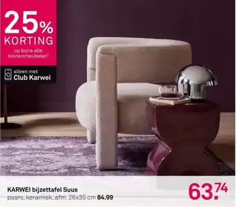 De Karwei bijzettafel Suus is een stijlvolle toevoeging aan elk interieur. Gemaakt van paars keramiek en met afmetingen van 26x35 cm, is deze tafel zowel praktisch als decoratief. En het beste van alles, Club Karwei leden krijgen maar liefst 25% korting op bijna alle binnenmeubelen, waaronder deze bijzettafel. Normaal gesproken kost de Karwei bijzettafel Suus 84.99, maar met de exclusieve korting voor Club Karwei leden is deze tafel nu extra voordelig. Profiteer van deze aanbieding en geef je interieur een frisse uitstraling met de Karwei bijzettafel Suus. Haal hem vandaag nog in huis en geniet van zijn unieke design en functionaliteit.