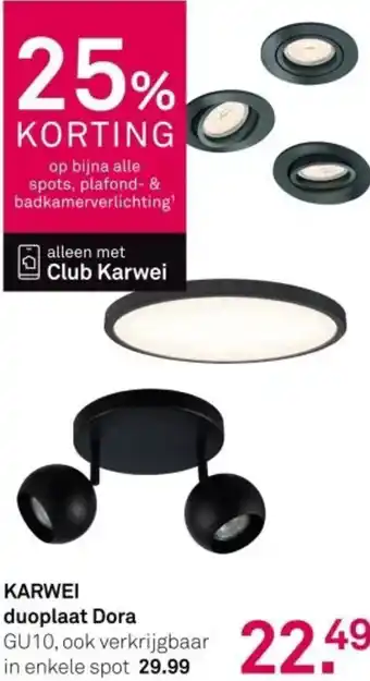 Profiteer nu van 25% KORTING op de KARWEI duoplaat Dora, een prachtige toevoeging aan je interieur. Deze duoplaat is ideaal voor het verlichten van verschillende ruimtes in huis en is ook verkrijgbaar in een enkele spot voor slechts 22.49 euro. De duoplaat is geschikt voor GU10 lampen en past perfect bij moderne interieurs. Deze aanbieding geldt op bijna alle spots, plafond- & badkamerverlichting, exclusief voor Club Karwei leden. Mis deze kans niet om je huis sfeervol te verlichten met de KARWEI duoplaat Dora. Kom snel naar de winkel of bestel online en profiteer van deze geweldige korting!