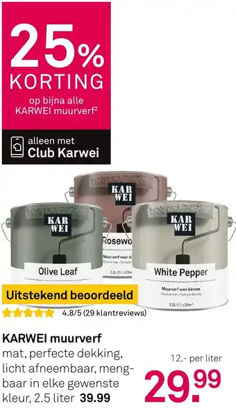 Karwei biedt naast de KARWEI muurverf een ruime collectie producten aan. Houd de wekelijkse Karwei folder in de gaten om de beste aanbiedingen en acties te vinden. Naast KARWEI muurverf, kunt u ook de volgende aanbiedingen vinden: KARWEI muurverf, Sikkens muurverf & Fairf muurverf.