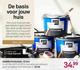 Kan jouw huis wel een opknapbeurt gebruiken? Dan denk je aan Karwei! Met KARWEI Perfectdek muurverf ben je verzekerd van een optimaal dekkend resultaat. Deze dekkende muurverf is verkrijgbaar in wit, RAL9010 of 9016 en heeft een matte afwerking. Bovendien is de verf goed reinigbaar (schrobklasse 2), waardoor je muren er lang mooi uit blijven zien. Voor slechts 52.99 euro heb je al een emmer van 10 liter, wat neerkomt op slechts 3.50 per liter. Met Club Karwei profiteer je van extra voordelen en kortingen. Kies voor KARWEI Perfectdek en geef jouw huis de perfecte uitstraling die het verdient!
