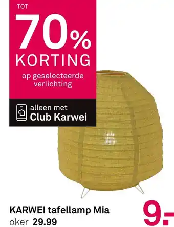 De prijs van de KARWEI tafellamp Mia kan ook teruggevonden worden hierboven op de pagina, samen met de datum van wanneer de aanbieding beschikbaar is. Ook kun je de prijzen in de huidige Karwei folder of op de Karwei website controleren. De aanbiedingen verzekeren je van het kopen van de Karwei producten voor de laagste prijs.