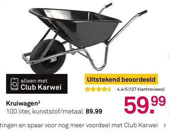 Met de Kruiwagen² van Karwei haal je een topkwaliteit product in huis. Deze kruiwagen heeft een inhoud van maar liefst 100 liter en is gemaakt van duurzaam kunststof en metaal. Dankzij de uitstekende beoordeling van 4.4/5 sterren op basis van 127 klantreviews weet je zeker dat je een goede keuze maakt. En met de speciale aanbieding van 89.99 in plaats van 59,99 profiteer je ook nog eens van een mooie korting. Als Club Karwei lid kun je zelfs nog meer voordeel behalen door te sparen voor extra kortingen. Mis deze kans niet en haal de Kruiwagen² snel in huis! (1)Geldig t/m 29 maart 2026. (2)Geldig t/m 17 mei 2026.