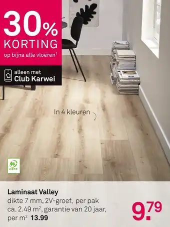 Profiteer nu van 30% KORTING op bijna alle vloeren¹, waaronder Laminaat Valley. Dit laminaat is verkrijgbaar in 4 kleuren en heeft een dikte van 7 mm met 2V-groef. Elk pak bevat ongeveer 2.49 m² en heeft een garantie van 20 jaar. Alleen met Club Karwei kun je deze korting krijgen, dus meld je snel aan! Het Laminaat Valley is PEFC-gecertificeerd, wat betekent dat het afkomstig is uit duurzaam beheerde bossen. De prijs per m² is nu slechts 13.99, in plaats van 19.99. Mis deze kans niet om je vloer te vernieuwen met kwalitatief laminaat voor een scherpe prijs. Kom naar Karwei en ontdek de voordelen van Laminaat Valley!