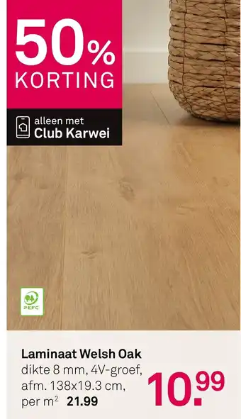 Profiteer nu van een geweldige aanbieding op Laminaat Welsh Oak met een dikte van 8 mm en 4V-groef. Dit PEFC-gecertificeerde laminaat heeft een afmeting van 138x19.3 cm en is verkrijgbaar voor slechts 10.99 per m², met 50% korting exclusief voor Club Karwei leden. Met de natuurlijke uitstraling van eikenhout en de duurzaamheid van PEFC-gecertificeerd materiaal, is dit laminaat de perfecte keuze voor elke ruimte in huis. Of je nu een nieuwe vloer wilt leggen in de woonkamer, slaapkamer of keuken, Laminaat Welsh Oak biedt kwaliteit en stijl voor een betaalbare prijs. Mis deze kans niet en haal vandaag nog dit prachtige laminaat in huis!