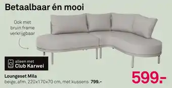 De prijs van de Loungeset Mila kan ook teruggevonden worden hierboven op de pagina, samen met de datum van wanneer de aanbieding beschikbaar is. Ook kun je de prijzen in de huidige Karwei folder of op de Karwei website controleren. De aanbiedingen verzekeren je van het kopen van de Karwei producten voor de laagste prijs.