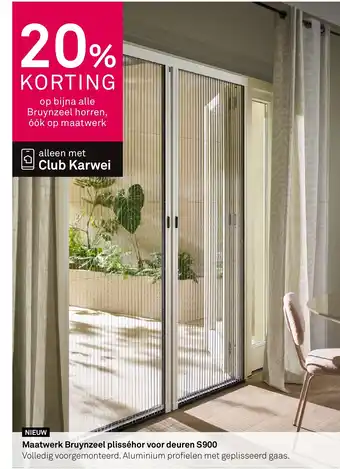 Profiteer nu van 20% KORTING op bijna alle Bruynzeel horren, óók op maatwerk, alleen met Club Karwei! Ontdek de NIEUWE Maatwerk Bruynzeel plisséhor voor deuren S900, volledig voorgemonteerd en voorzien van aluminium profielen met geplisseerd gaas. Deze plisséhor is perfect geschikt voor deuren en zorgt ervoor dat insecten buiten worden gehouden terwijl frisse lucht naar binnen kan stromen. Dankzij het maatwerk past de hor perfect op jouw deur, zonder gedoe met knippen of zagen. Profiteer van de korting en geniet deze zomer van een insectenvrije woning met de Maatwerk Bruynzeel plisséhor voor deuren S900!