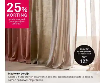 Op zoek naar een uniek en op maat gemaakt gordijn? Profiteer nu van 25% korting op alle maatwerk (vouw)gordijnen vanaf slechts 50.-. Bij ons heb je de keuze uit vele stoffen en afwerkingen, zodat je jouw ideale gordijn kunt samenstellen. Of je nu op zoek bent naar verduisterende gordijnen voor de slaapkamer of lichtdoorlatende gordijnen voor de woonkamer, bij ons vind je het allemaal. Bovendien wordt jouw gordijn gratis op maat gemaakt per meter, vanaf slechts 16.99 per meter. Ga snel naar karwei.nl/gordijnen en stel op eenvoudige wijze jouw perfecte gordijn samen. Mis deze kans niet en geef jouw interieur een nieuwe uitstraling met onze maatwerk gordijnen!