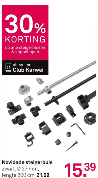 Profiteer nu van een speciale aanbieding bij Club Karwei! Ontvang 50% korting op de Novidade steigerbuis zwart van 27 mm en een lengte van 200 cm. Normaal gesproken kosten deze artikelen samen 21.99, maar met de korting betaal je slechts 15,39. Deze aanbieding geldt exclusief voor Club Karwei leden. Daarnaast ontvang je ook nog eens 30% korting op alle andere steigerbuizen en koppelingen in het assortiment. Mis deze kans niet en haal snel jouw steigerbuis met korting in huis. De Novidade steigerbuis is van hoge kwaliteit en perfect voor diverse klussen en projecten. Wees er snel bij, want op = op!