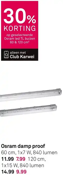 De prijs van de Osram damp proof kan ook teruggevonden worden hierboven op de pagina, samen met de datum van wanneer de aanbieding beschikbaar is. Ook kun je de prijzen in de huidige Karwei folder of op de Karwei website controleren. De aanbiedingen verzekeren je van het kopen van de Karwei producten voor de laagste prijs.