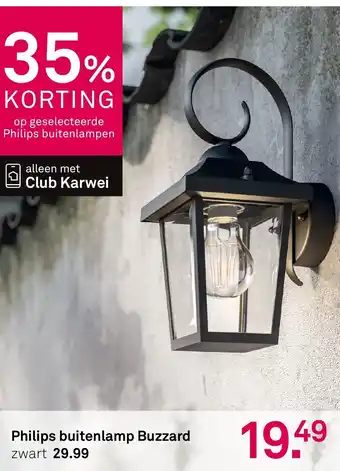 De prijs van de Philips buitenlamp Buzzard kan ook teruggevonden worden hierboven op de pagina, samen met de datum van wanneer de aanbieding beschikbaar is. Ook kun je de prijzen in de huidige Karwei folder of op de Karwei website controleren. De aanbiedingen verzekeren je van het kopen van de Karwei producten voor de laagste prijs.