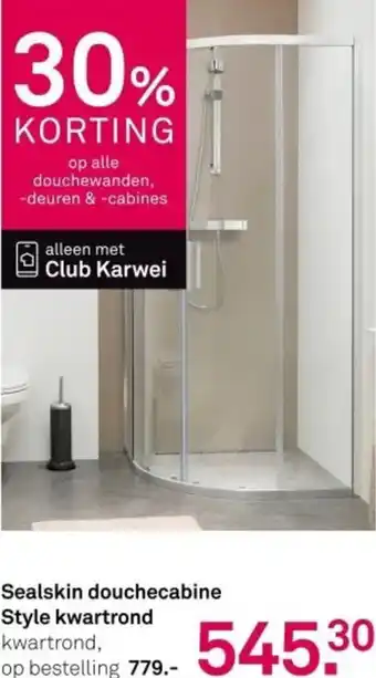 Profiteer nu van 25% korting op de Sealskin douchecabine Style kwartrond, normaal 779.- nu voor slechts 545.30. Deze moderne en stijlvolle douchecabine past perfect in elke badkamer. De kwartronde vorm zorgt voor een ruimtelijk effect en de hoogwaardige materialen garanderen jarenlang doucheplezier. Deze aanbieding geldt alleen met Club Karwei en op bestelling. Daarnaast ontvang je ook nog eens 30% korting op alle douchewanden, -deuren & -cabines. Mis deze kans niet om jouw badkamer een upgrade te geven met een prachtige douchecabine en profiteer van flinke kortingen. Kom snel naar Karwei en maak gebruik van deze geweldige aanbiedingen!