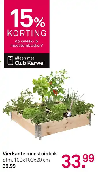 De prijs van de Vierkante Moestuinbak kan ook teruggevonden worden hierboven op de pagina, samen met de datum van wanneer de aanbieding beschikbaar is. Ook kun je de prijzen in de huidige Karwei folder of op de Karwei website controleren. De aanbiedingen verzekeren je van het kopen van de Karwei producten voor de laagste prijs.