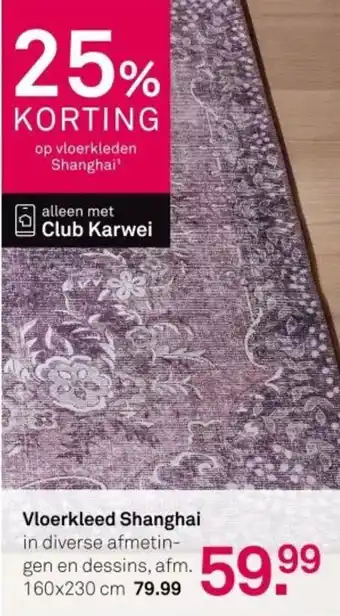 Profiteer nu van 25% korting op het vloerkleed Shanghai bij Club Karwei. Dit prachtige vloerkleed is verkrijgbaar in diverse afmetingen en dessins, waaronder de afmeting 160x230 cm voor slechts 59.99 in plaats van 79.99. Het vloerkleed Shanghai is een stijlvolle toevoeging aan elk interieur en zorgt voor extra warmte en comfort in huis. Of je nu op zoek bent naar een eyecatcher voor de woonkamer of een zachte ondergrond voor de slaapkamer, dit vloerkleed voldoet aan al jouw wensen. Mis deze geweldige aanbieding niet en haal snel jouw vloerkleed Shanghai met korting in huis!