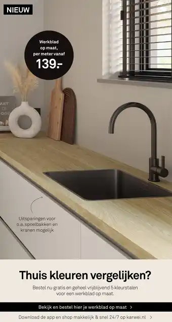 De prijs van de Werkblad op maat kan ook teruggevonden worden hierboven op de pagina, samen met de datum van wanneer de aanbieding beschikbaar is. Ook kun je de prijzen in de huidige Karwei folder of op de Karwei website controleren. De aanbiedingen verzekeren je van het kopen van de Karwei producten voor de laagste prijs.