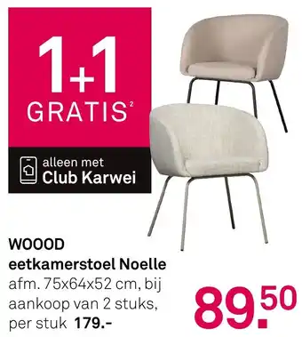 Profiteer nu van de speciale aanbieding op de WOOOD eetkamerstoel Noelle bij Karwei. Bij aankoop van 2 stuks ontvang je de tweede stoel helemaal gratis! Deze stijlvolle eetkamerstoel heeft een afmeting van 75x64x52 cm en is perfect voor elke eetkamer. De stoel is gemaakt van hoogwaardige materialen en heeft een tijdloos design dat in elk interieur past. Normaal gesproken kost deze stoel 179.- per stuk, maar met deze actie betaal je slechts 89.50 per stoel. Let op: deze aanbieding geldt alleen voor Clubleden van Karwei. Mis deze kans niet en haal snel de WOOOD eetkamerstoel Noelle in huis voor een scherpe prijs!