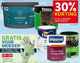 Op vrijdag 1 mei en zaterdag 2 mei ontvang je bij Klus Wijs maar liefst 30% korting op alle merken verf en beits. Profiteer van deze aanbieding en geef je houten schuren, loodsen, molens en schuttingen een nieuwe uitstraling met onder andere Tenco Houtcoat Zwart dekkend zijdeglans. Let op: de actie geldt niet voor Vast Laag, Flexa, Histor, Wijzonol, Bouwverven, Gebro, RAL, Ceta, Evert, LBH, Silicon Alkyd Hoogglanslak, Basic, Tuinhout Beits en producten van Stro de Binn. Bij aankoop van minimaal €15,- ontvang je bovendien gratis tuinhandschoenen. Wees er snel bij, want op=op!