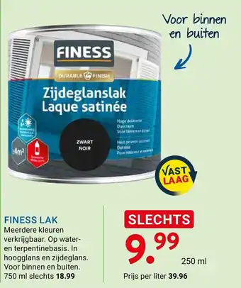 FINESS LAK is een duurzame finish zijdeglanslak, verkrijgbaar in meerdere kleuren. Deze lak is zowel geschikt voor binnen als buiten en is beschikbaar op water- en terpentinebasis. Met een inhoud van 750 ml kost deze lak slechts 18.99, wat neerkomt op een prijs van slechts 9.99 per liter. De FINESS LAK biedt een mooie zijdeglansafwerking en is zeer duurzaam. De zwarte kleur zorgt voor een stijlvolle uitstraling. Profiteer van de VAST LAAG prijs en geef je projecten een professionele afwerking met deze hoogwaardige lak. Of je nu meubels, kozijnen of andere oppervlakken wilt verven, met FINESS LAK ben je verzekerd van een kwalitatief resultaat.