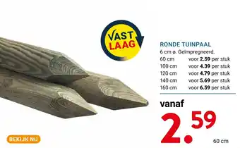 De prijs van de Ronde tuinpaal kan ook teruggevonden worden hierboven op de pagina, samen met de datum van wanneer de aanbieding beschikbaar is. Ook kun je de prijzen in de huidige Kluswijs folder of op de Kluswijs website controleren. De aanbiedingen verzekeren je van het kopen van de Kluswijs producten voor de laagste prijs.