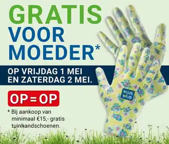 Op vrijdag 1 mei en zaterdag 2 mei ontvangt u bij aankoop van minimaal €15,- gratis tuinhandschoenen voor moeder. Wees er snel bij, want OP=OP! Verras uw moeder met dit praktische en mooie cadeau, perfect voor het tuinieren in de lente. De tuinhandschoenen zijn van hoge kwaliteit en zorgen ervoor dat uw moeder comfortabel en beschermd kan werken in de tuin. Of u nu bloemen plant, onkruid wiedt of groenten verbouwt, deze tuinhandschoenen zijn een onmisbaar hulpmiddel. Kom langs in onze winkel en profiteer van deze speciale aanbieding voor moeder. Maak van Moederdag een onvergetelijke dag met een attent en nuttig geschenk voor de groene vingers van uw moeder!