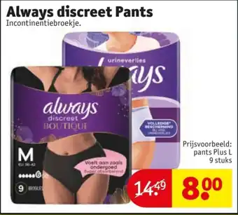 Kruidvat biedt naast de Always discreet Pants een ruime collectie producten aan. Houd de wekelijkse Kruidvat folder in de gaten om de beste aanbiedingen en acties te vinden. Naast Always discreet Pants, kunt u ook de volgende aanbiedingen vinden: Always Discreet enkelpak M.u.v pants., Always Discreet & Always Discreet.