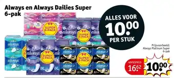 Kruidvat biedt naast de Always en Always Dailies Super een ruime collectie producten aan. Houd de wekelijkse Kruidvat folder in de gaten om de beste aanbiedingen en acties te vinden. Naast Always en Always Dailies Super, kunt u ook de volgende aanbiedingen vinden: Always, Always Dailies, Always Discreet en Tampax, Always en Always Dailies Cotton en Platinum & Always en Always Dailies Premium singlepack.
