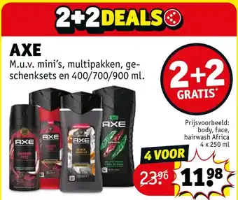 Kruidvat biedt naast de Axe een ruime collectie producten aan. Houd de wekelijkse Kruidvat folder in de gaten om de beste aanbiedingen en acties te vinden. Naast Axe, kunt u ook de volgende aanbiedingen vinden: Axe deodorant, AXE Deodorant excite & Axe Apollo showergel.